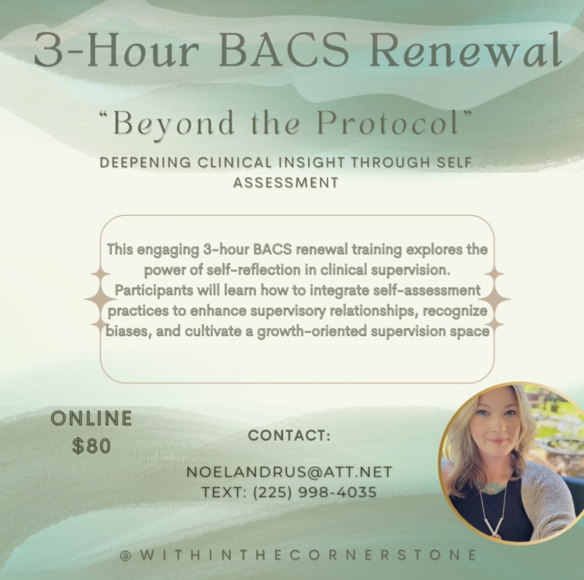 This 3-hour BACS renewal training explores the power of self-reflection in clinical supervision. Participants will learn how to integrate self-assessment practices to enhance their supervisory relationships, recognize biases, and cultivate a growth-oriented supervision space. Through interactive discussions and experiential exercises, this training will provide practical tools to deepen awareness, strengthen ethical decision-making, and refine the use of self in supervision