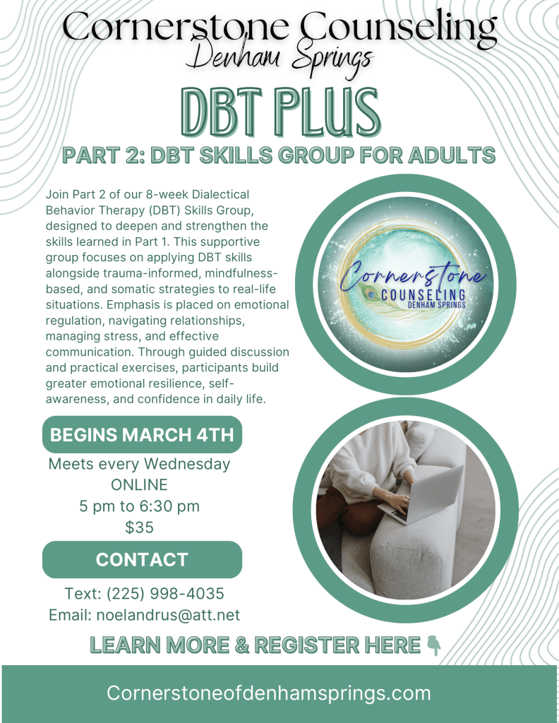 At Cornerstone Counseling, we understand that navigating these challenges takes more than just willpower. it takes the right tools and support. DBT Plus is an 8-week Dialectical Behavior Therapy (DBT) Skills Group offering space to embody the qualities needed to manage emotions, handle stress, and build healthier relationships.