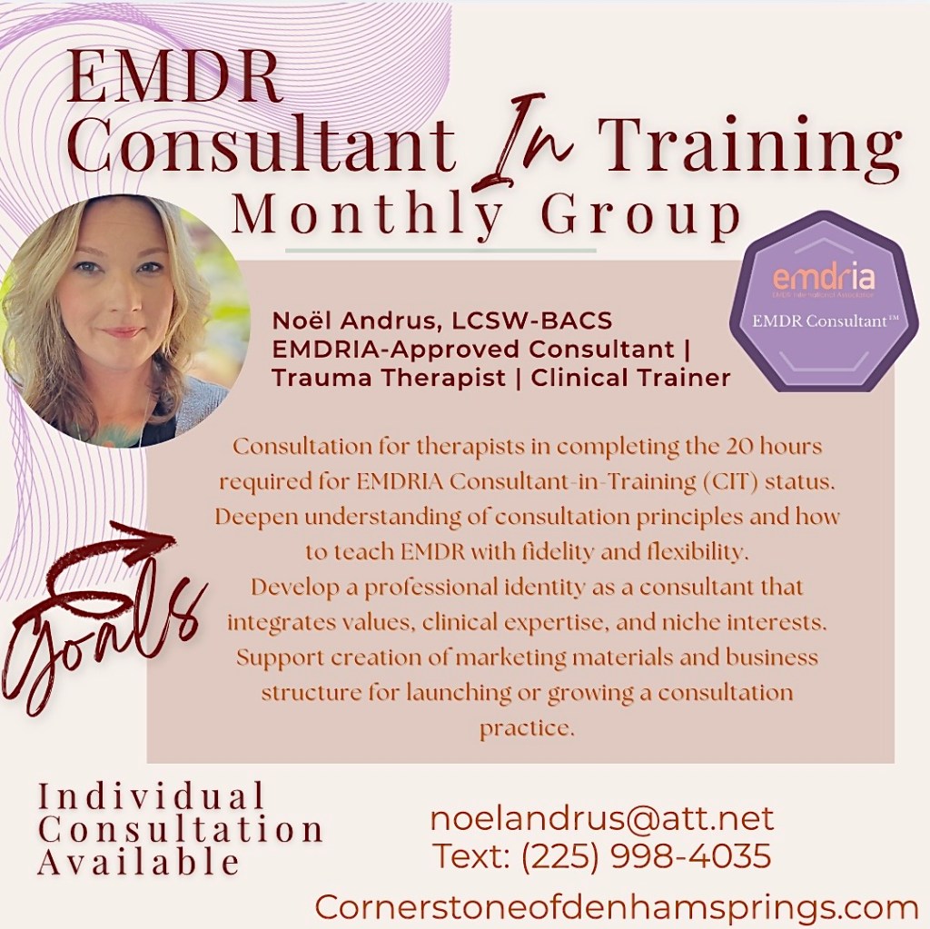 If you are interested in EMDR Consultation or Intensive services please contact using the form below; email noelandrus@att.net; or text (225) 998-4035 to get started: