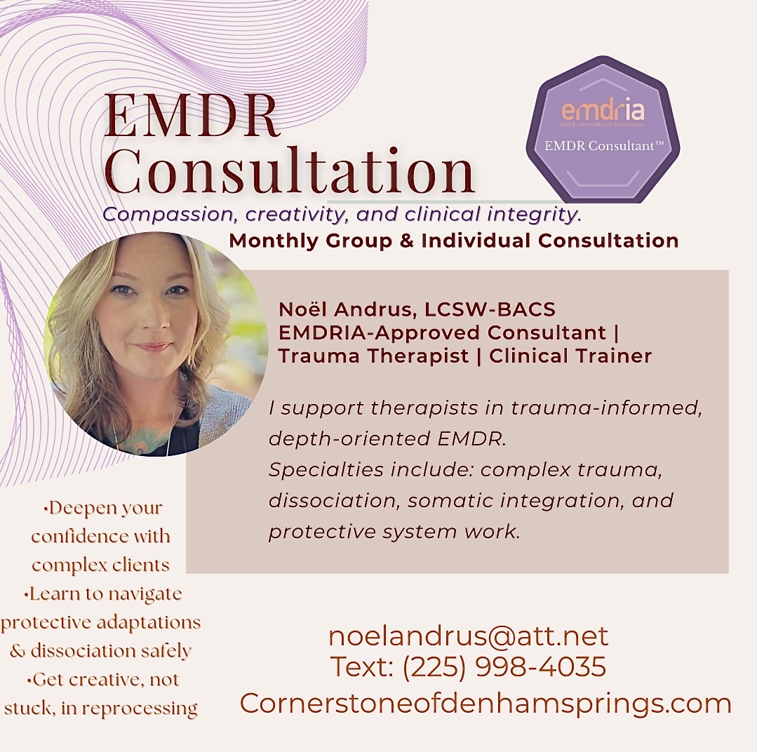 If you are interested in EMDR Consultation or Intensive services please contact using the form below; email noelandrus@att.net; or text (225) 998-4035 to get started: